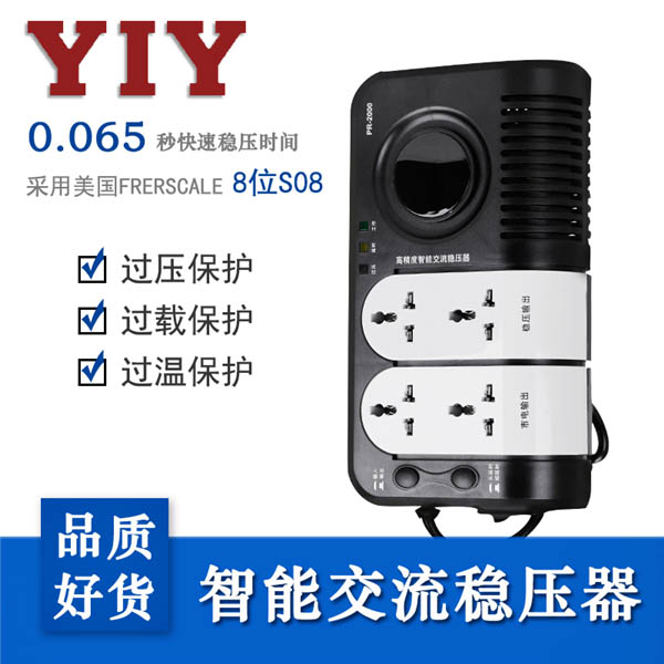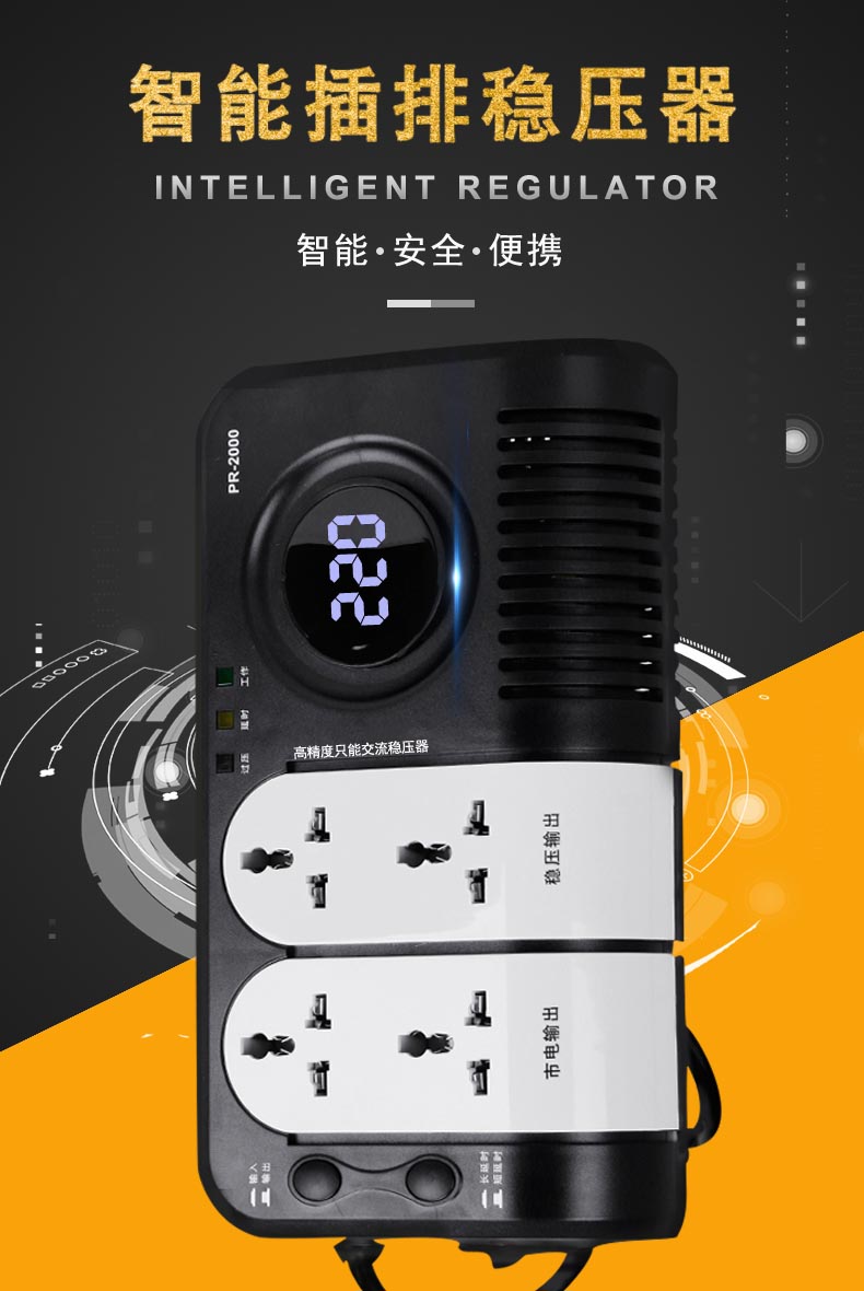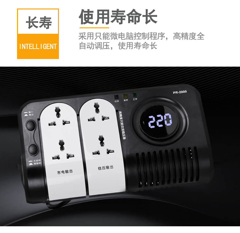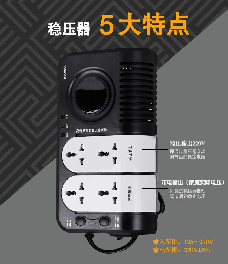 產品簡介: PR-2000系列是我公司新開發的一款全自動智能型便攜式穩壓器,為滿足日益增加的便攜式電源的需求而設計,該穩壓器擁有緊湊和時尚的外觀,蜂鳴報警、智能過載保護等功率。 適用于1000W以下的負載設備,如電腦、電視、冰箱、麻將機等小功率家電設備和數碼產品。